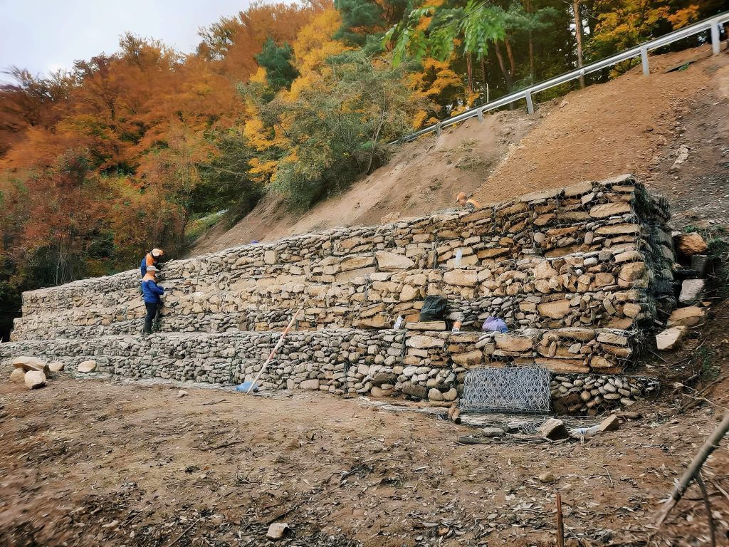 Конструкція з 130 габіонних ящиків, наповнених природним каменем, забезпечить стійкість схилу та відведення води.